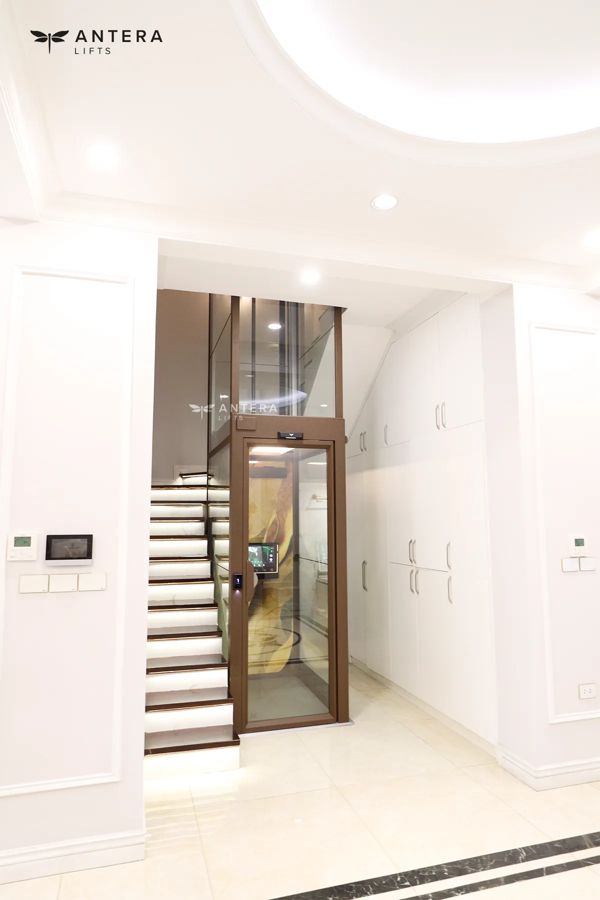 Với màu sắc Cedar Brown sang trọng kết hợp kính cường lực trong suốt, thang máy không chỉ phục vụ nhu cầu di chuyển mà còn là điểm nhấn kiến trúc nâng tầm giá trị biệt thự. Đây là lựa chọn hoàn hảo cho những gia chủ mong muốn một thang máy kính cho biệt thự vừa hiện đại, vừa bền vững.
